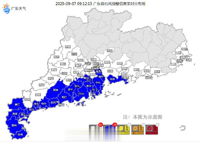 截至9时12分,广东共有66个台风预警信号生效中(42个白色、24个蓝色),与此同时,雷雨也开始在西边作业,徐闻、雷州、湛江、吴川、茂名、电白、台山、开平、高要、肇庆雷雨大风黄色预警信号生效中,恰逢周末,海边游玩项目请暂停;海上渔船需及时回港避风。