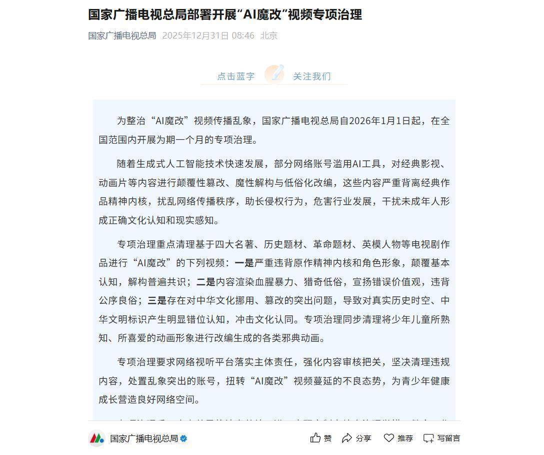 12月31日,国家广播电视总局部署开展“AI魔改”视频专项治理。通知称,随着生成式人工智能技术快速发展,部分网络账号滥用AI工具,对经典影视、动画片等内容进行颠覆性篡改、魔性解构与低俗化改编,这些内容严重背离经典作品精神内核,扰乱网络传播秩序,助长侵权行为,危害行业发展,干扰未成年人形成正确文化认知和现实感知。