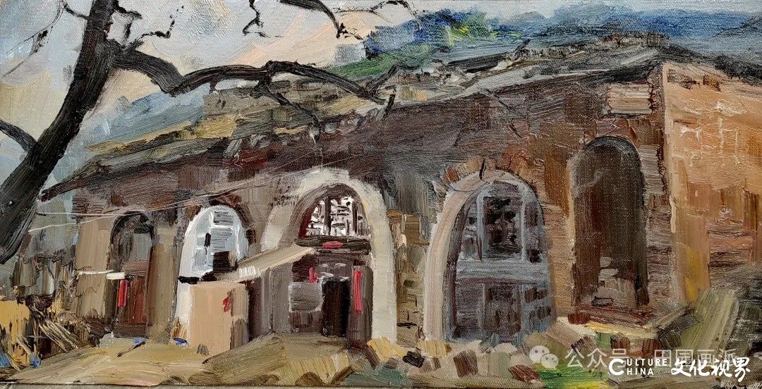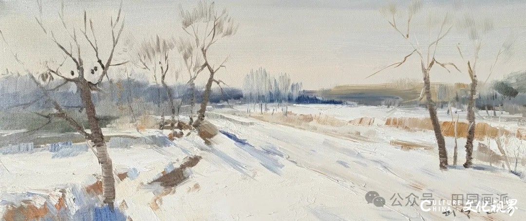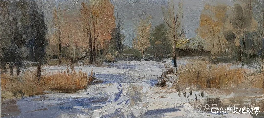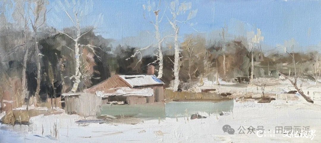 他的色彩以灰度叙事为基底,于细微色差中藏深意。其田园画系列摒弃甜腻,以灰绿、土黄、青灰来摹写土地的哑光质感,暮色农舍则借群青与赭石渐变暗喻时光流转,使画布成为记忆的容器;技法上,田园用渐变渲染,雪景以厚堆等复合技法塑形,皆融篆籀线条、篆刻 “残边” 意趣。冷暖对比暗合生命轮回,让景致盛纳历史厚度与生命韧性。