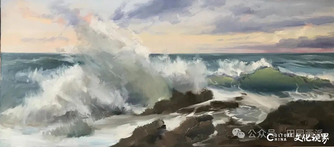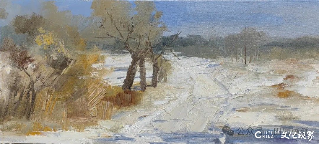 周武发的创作还贯穿着跨媒介技法的迁移,融书法笔意于笔触、肌理与线条,非形式模仿而重精神呼应——书法气韵与油画质感的碰撞,让浪涛得韵律、雪景显沉厚、枯树见苍劲。而更深层的是自然精神的通感:浪喻躁动、雪示沉淀、树显轮回,油画将自然物理属性化为精神符号,使观者触到风温、冰冽与木息,作品终究超越题材,成为了关于 “存在” 的视觉冥想。