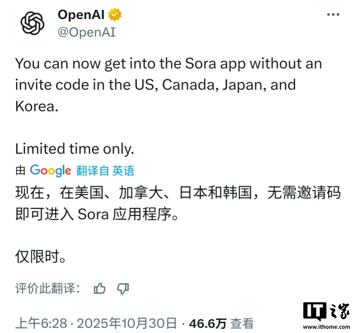 IT之家11月2日消息,OpenAI公司10月30日宣布,其备受关注的Sora应用程序限时取消邀请码要求益通网,允许美国、加拿大、日本和韩国地区的用户直接登录使用。