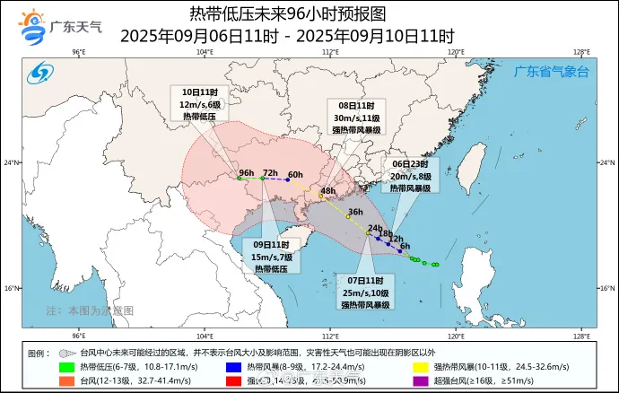 此外,陆地大风预报为,7-9日,受台风外围环流叠加强对流影响,珠三角南部市县、粤西市县及其沿海海面有8-11级大风,其余市县雷雨时伴有8-10级短时大风。